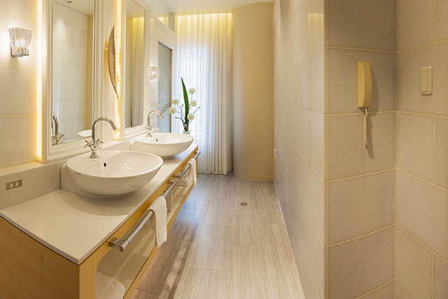 洗面ボールが2台設置されたゴージャスな造り。 日常から解き放たれるには十分に華やかなお部屋です。
